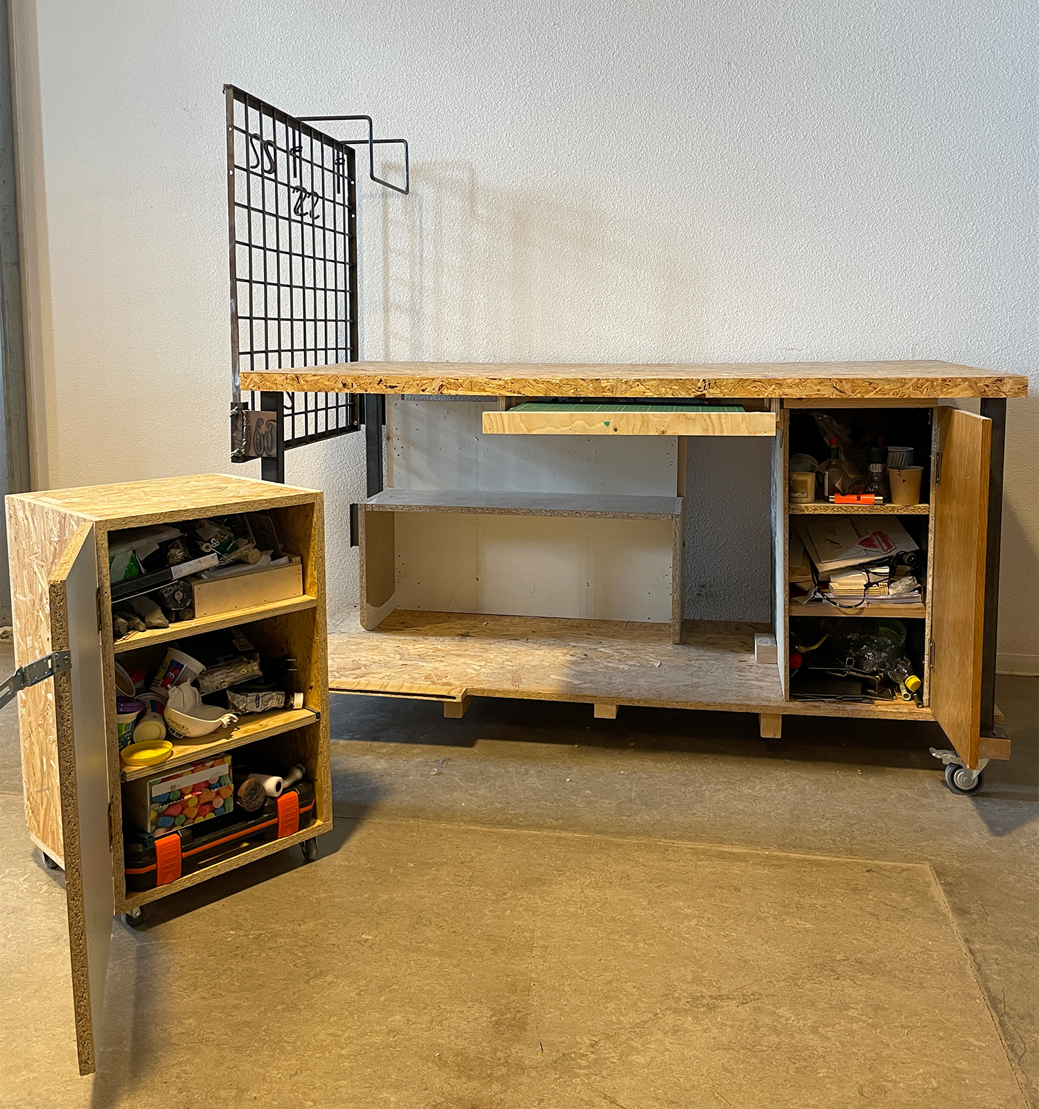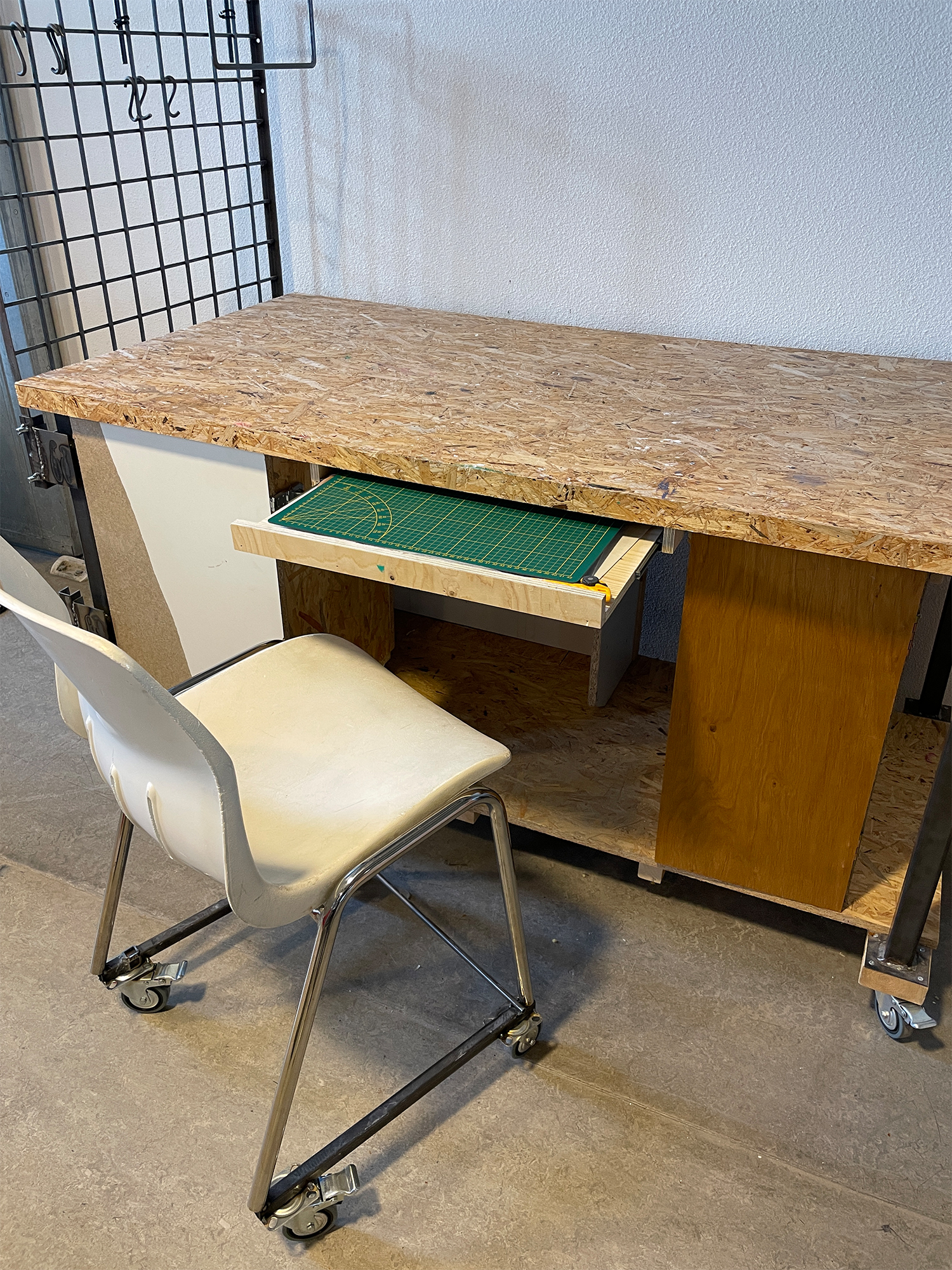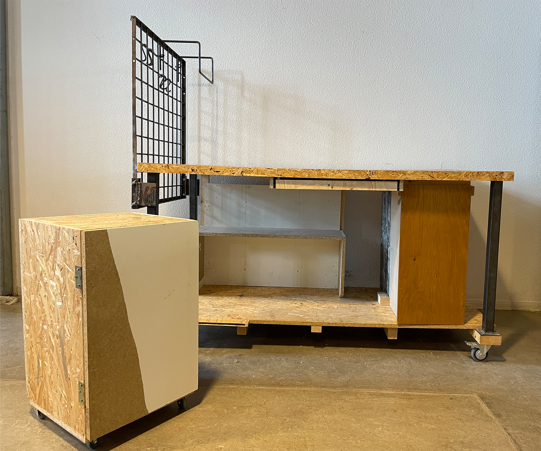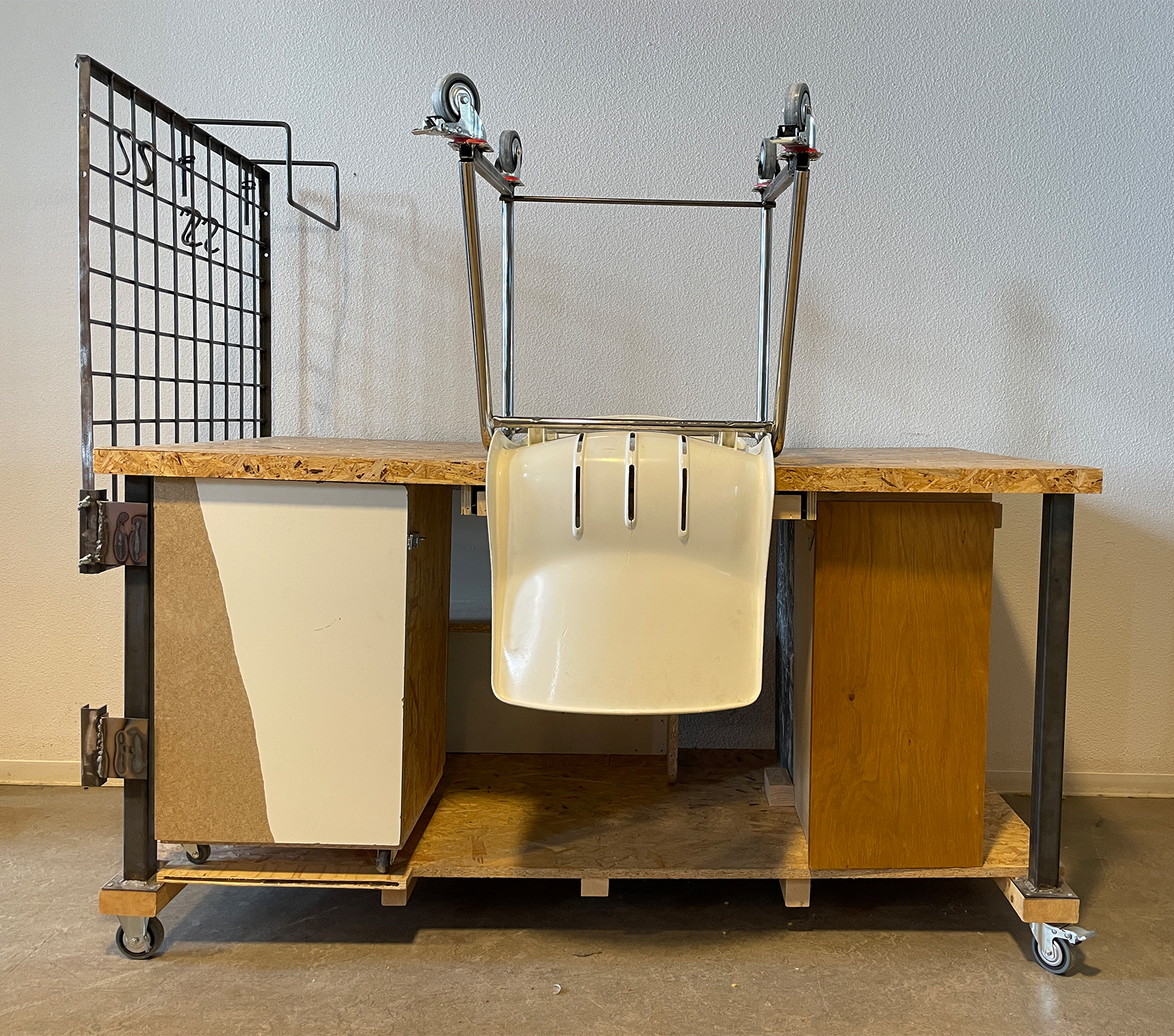 My own work desk created in my school studio of Kiki&Joost. Upcycled Materials which where found in and around school. Open storage for essential transportation good also known as Skateboard. Wheels on the chair provide rolling fun and the perfect height to work on the main surface. Comes with separate toolbox for all your goods to store.