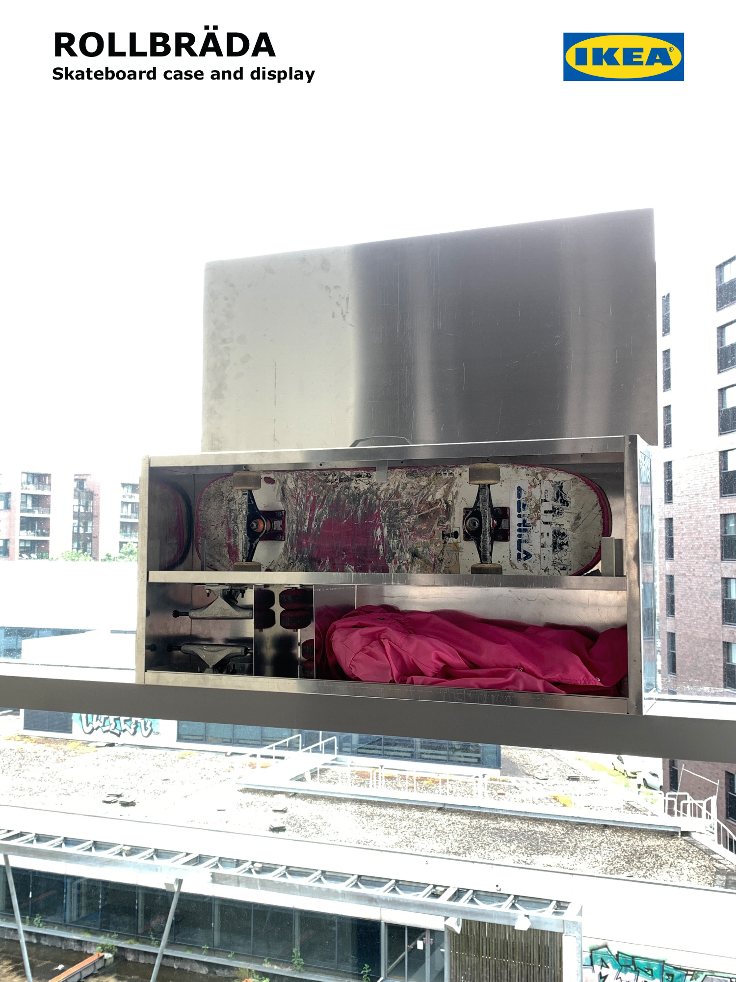 A case, that allows you to bring your skateboard to whatever destination you are travelling. Especially when you take the plane, since there is nothing more painful to pay an extra 80€ at the gate, because you have not checked in your skateboard. This Metal box, gives you the opportunity to check in your board, extra wheels, trucks and clothes safely and can be a display for whenever it is not in use. (fictional assignment for IKEA)
